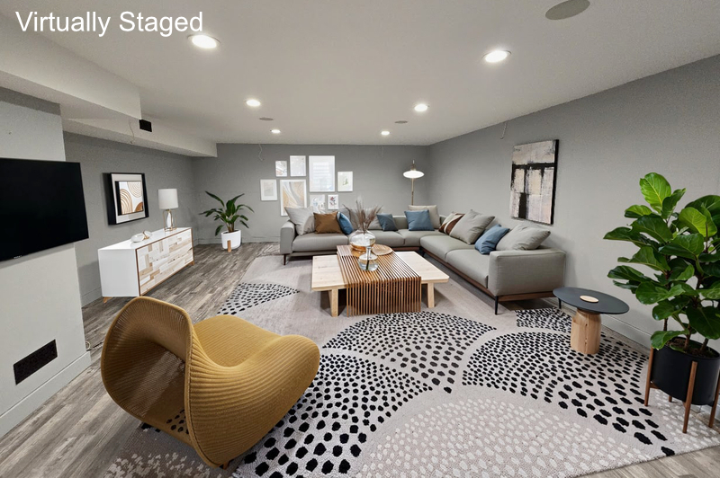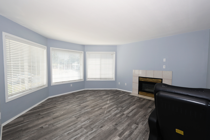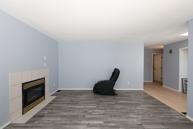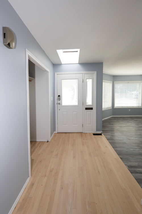living room fireplace, foyer skylight, maple hardwood flooring, vinyl plank