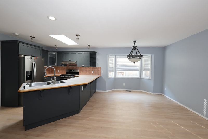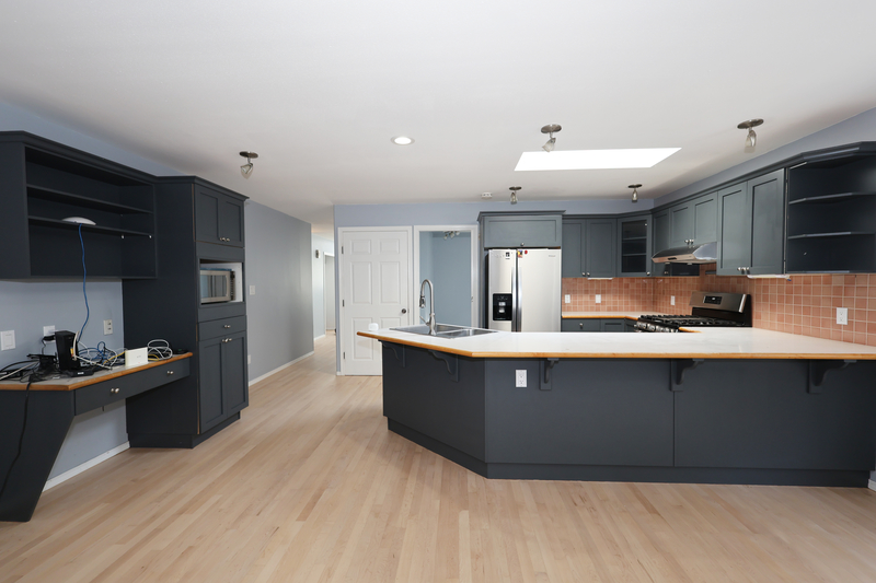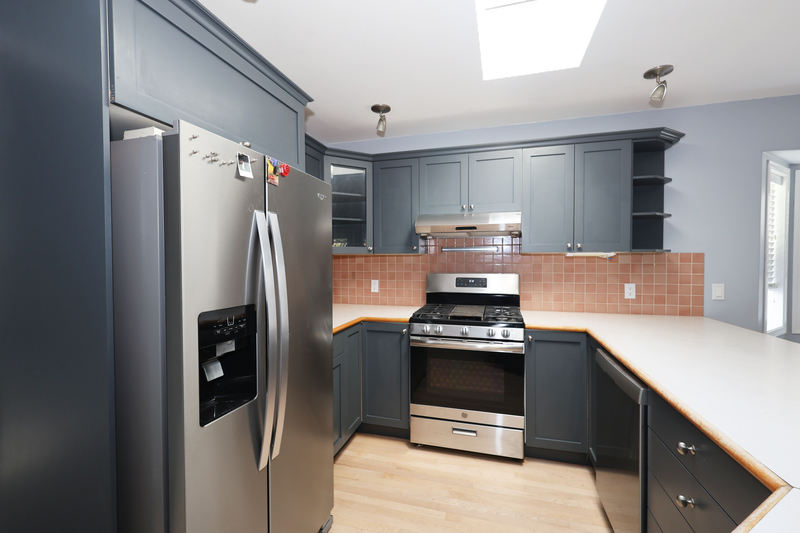 flooring, kitchen skylight, shaker style kitchen cabinets with ceramic tile
